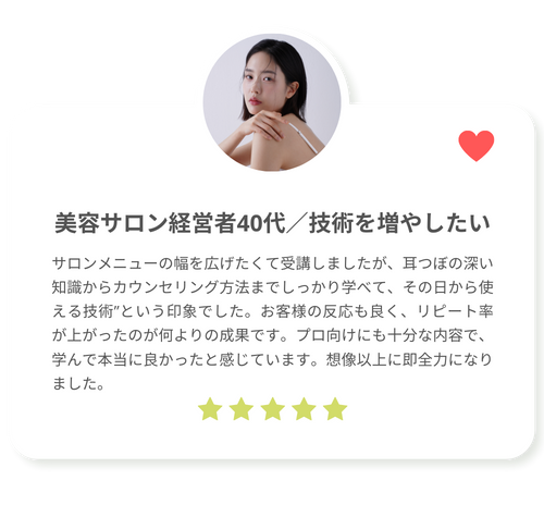 プロとして活動するための“本物の技術”を提供し、これまでに500名以上のセラピストが受講・活動をスタートしています。